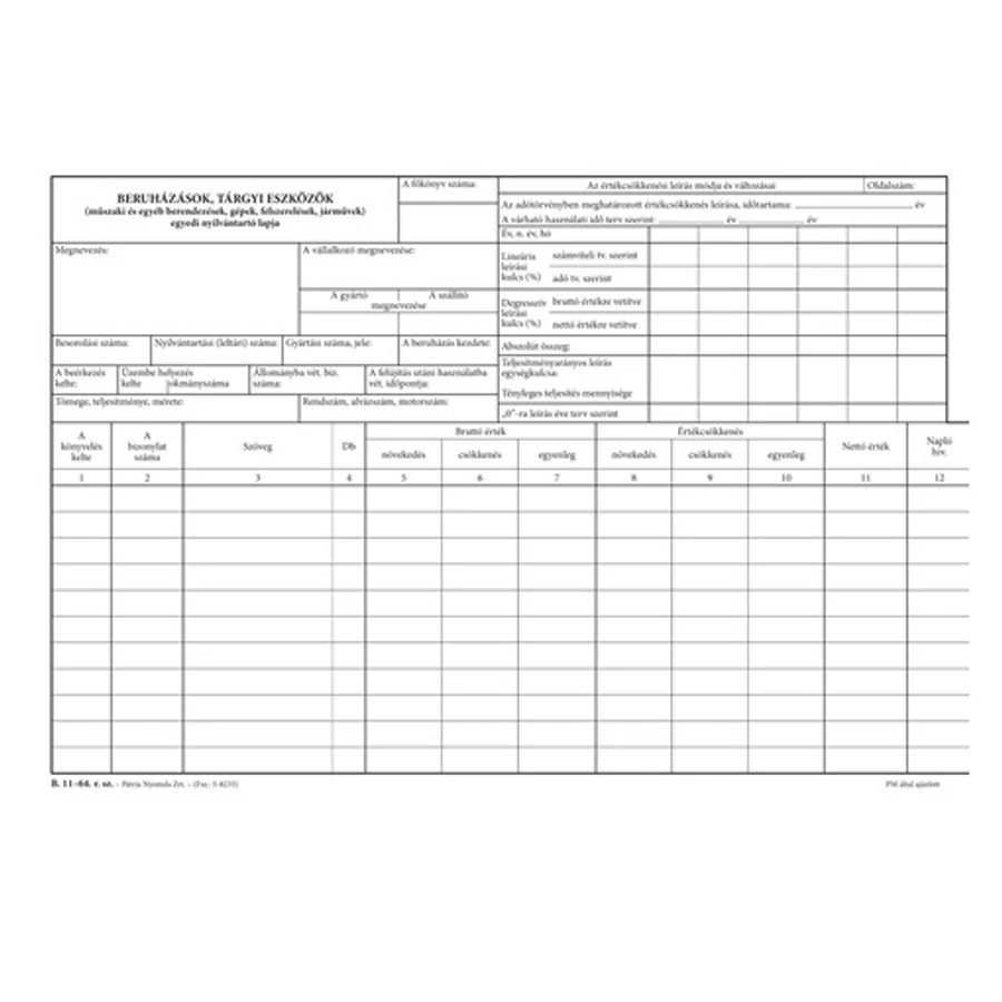 - beruházások, tárgyi eszközök (műszaki és egyéb berendezések, gépek, felszerelések, járművek) egyedi nyilvántartására szolgáló nyomtatvány