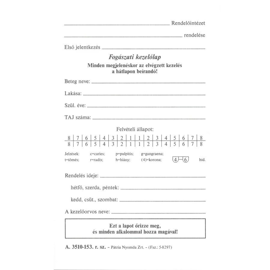 Fogászati kezelőlap 85x135 mm