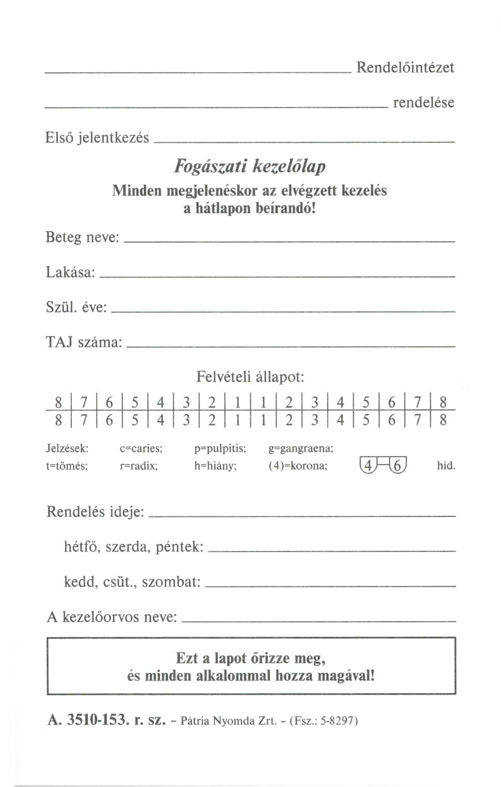 Gyógykezelési lap A/5 fekvő