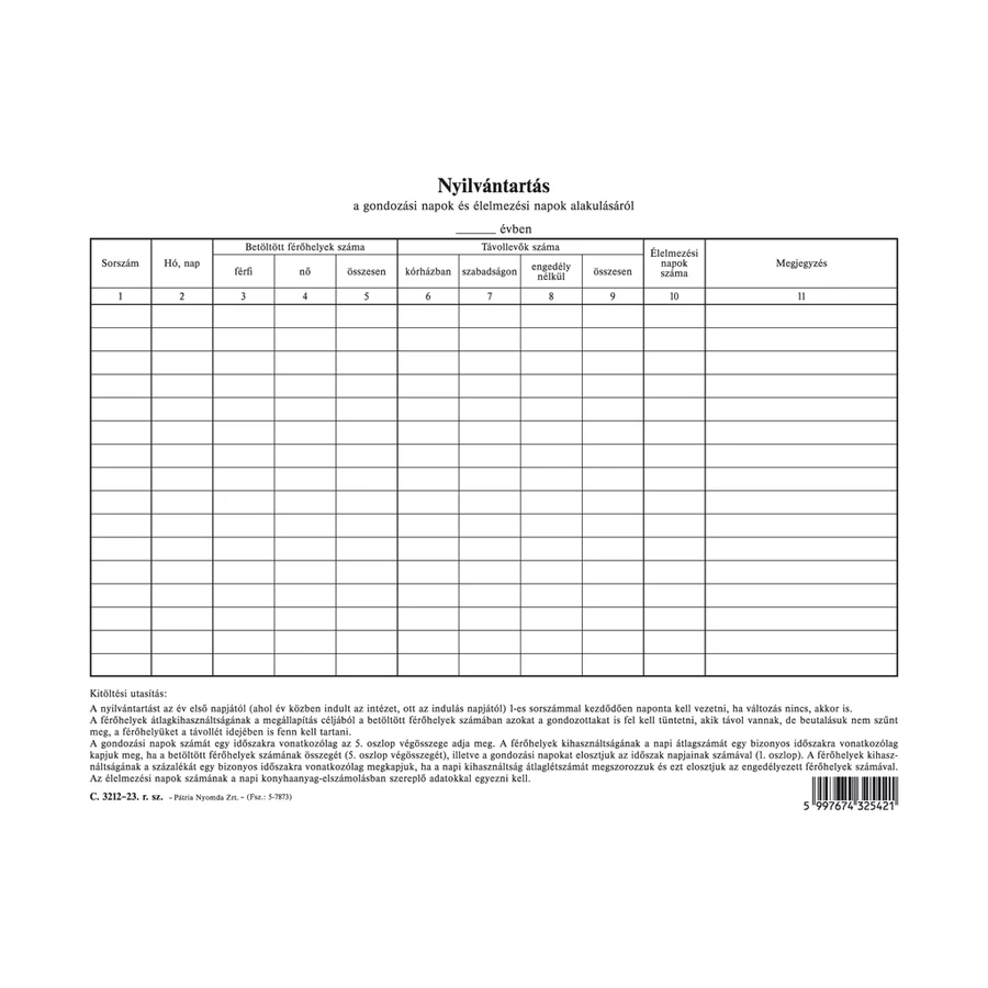 Nyilvántartás a gondozási napok és élelmezési napok alakulásáról szabadlap A/4 álló